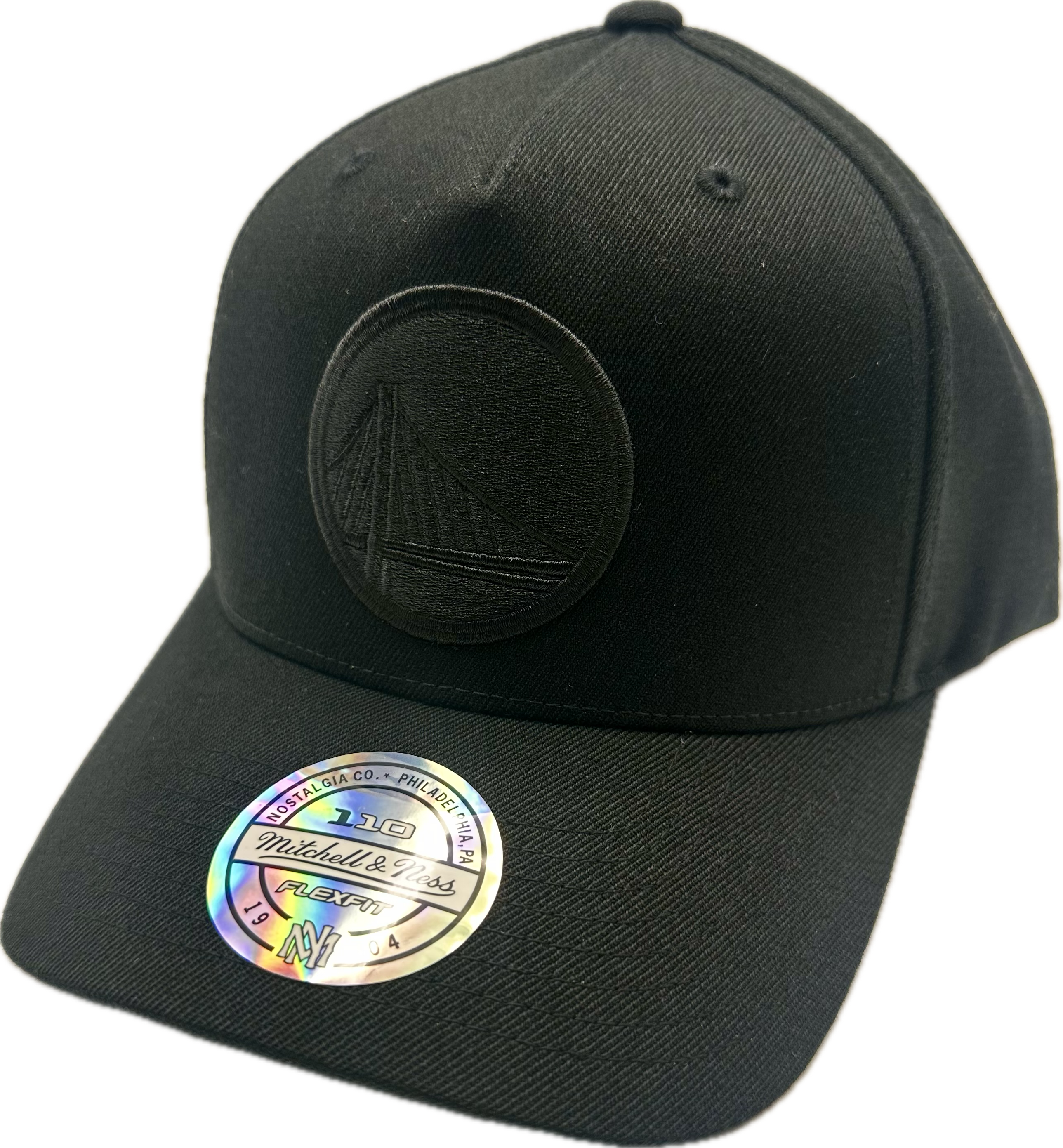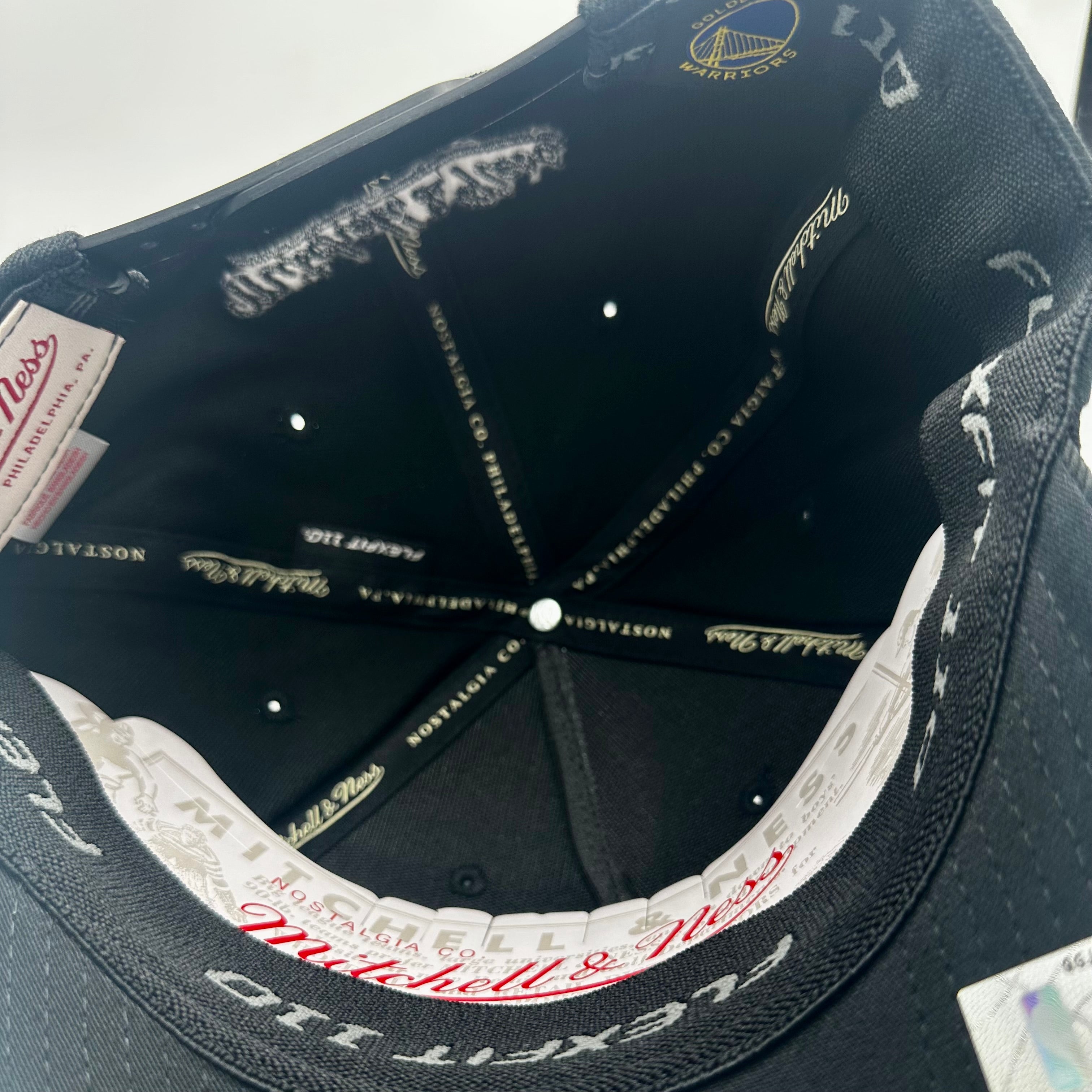 - Black Mitchell & Ness logo above a black snapback closure